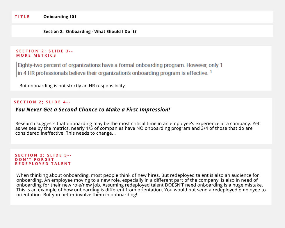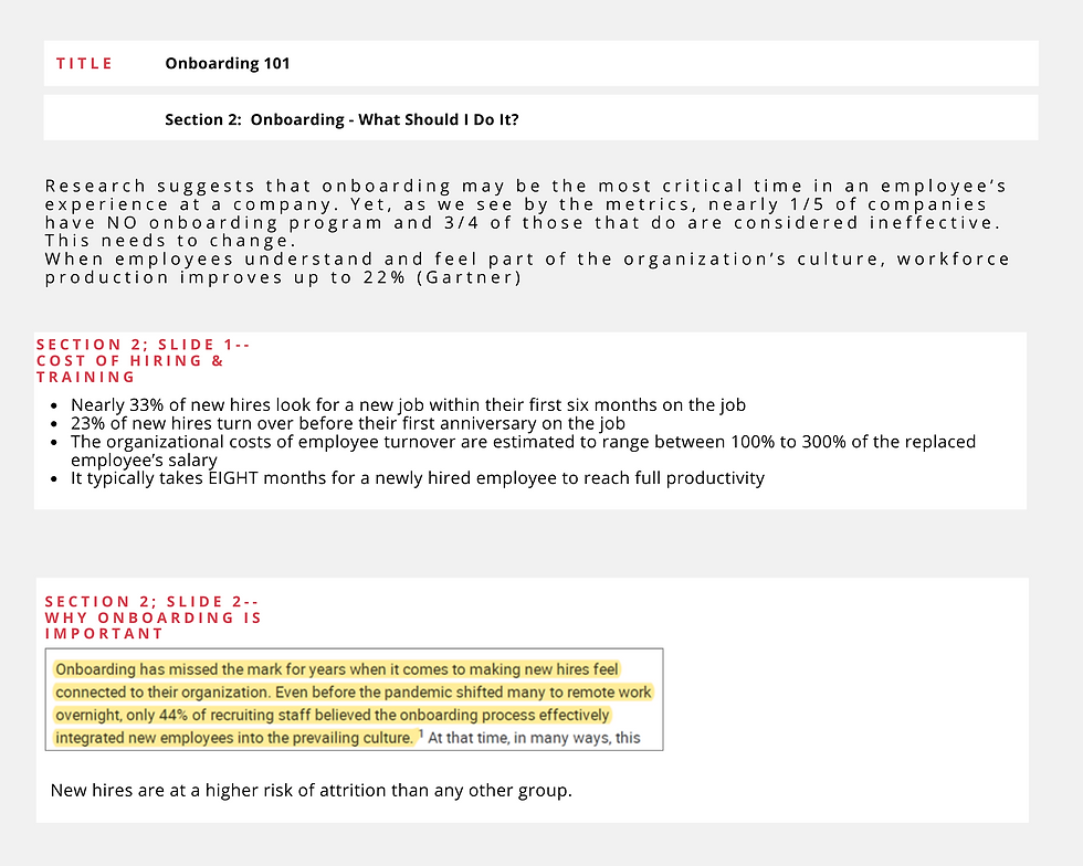 The information is broken down into three sections. First covers what is onboarding and how it differs from orientation. Second section is the largest and covers why do onboarding with lots of data regarding cost of hiring and training, how well companies currently do onboarding, and how employee engagement affects the company. The third section focuses on onboarding in a virtual world. This was already an issue before 2020. But with the pandemic and many companies choosing to not return to an office (at least not full-time), engaging employees virtually is a significant issue.